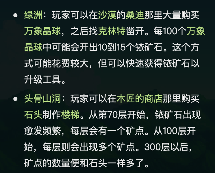 首頁 星露穀物語 問答 星露穀物語銥礦石哪裡多? 2023-01-02 1、銥礦石是游戲中的一種資源,它可從銥沉積物中獲得,亦是高級怪物的掉落物,主要通過采礦獲得,也可在旅行貨車處購買。2、頭骨山洞中從70層開始,就會有較多的銥礦礦點,每向下十層,礦點概率會提升。