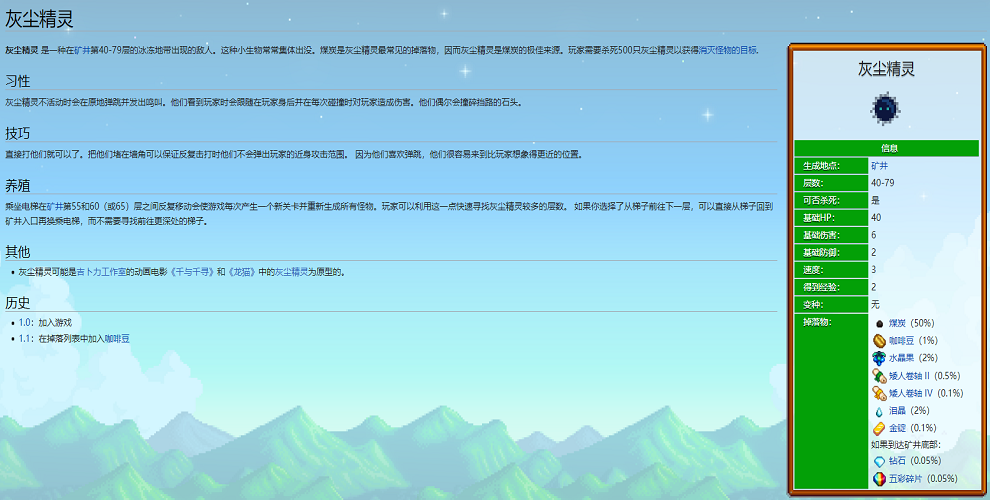 首頁 星露穀物語 問答 星露谷灰塵精靈在幾層? 2023-01-02 灰塵精靈是一種在礦井第40-79層的冰凍地帶出現的敵人。這種小生物常常集體出沒。煤炭是灰塵精靈最常見的掉落物,因而灰塵精靈是煤炭的極佳來源。
