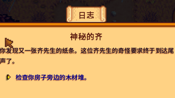 首頁 星露穀物語 問答 星露穀物語房子旁邊的木材堆在哪? 2023-01-03 1、星露穀物語游戲中,我們在神秘的齊任務中,發現齊先生的一張紙條:檢查房子旁邊的木材堆。2、房子旁邊的木材堆的具體位置如圖所示。我們可以從木材堆中翻出一張VIP卡,然後就可以開啟賭場。