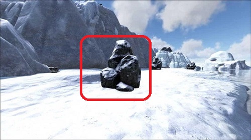 2、雪山開采,石油一般會在方舟的雪原地圖出現,像這種黑黑的豎型石頭就是石油了,用鎬子或甲龍採集獲得即可。