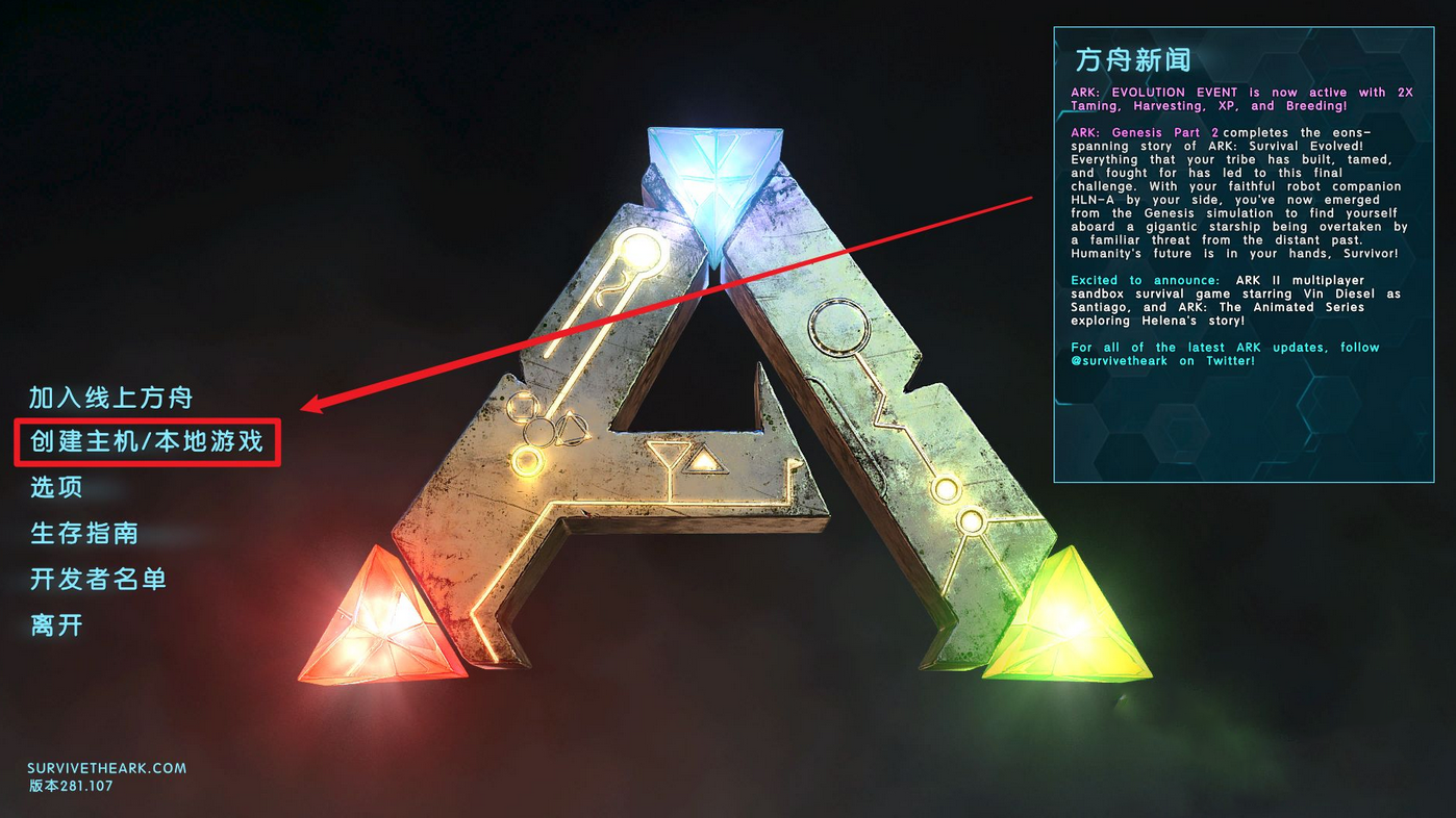 1、第一步,首先,打開方舟生存進化,點擊創建主機/本地游戲,如圖下所示。