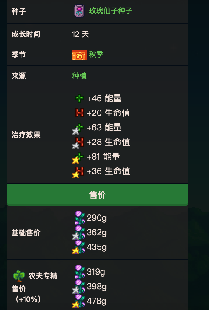 首頁 星露穀物語 問答 星露谷玫瑰仙子有用嗎? 2023-01-05 玫瑰仙子(Fairy Rose)是游戲星露穀物語里的一種農作物,由玫瑰仙子種子在秋季經過12天後長成,是有一定用處的。儘管玫瑰仙子的收益並不如預期,但玫瑰仙子蜂蜜是蜂蜜里利潤最高的一種。