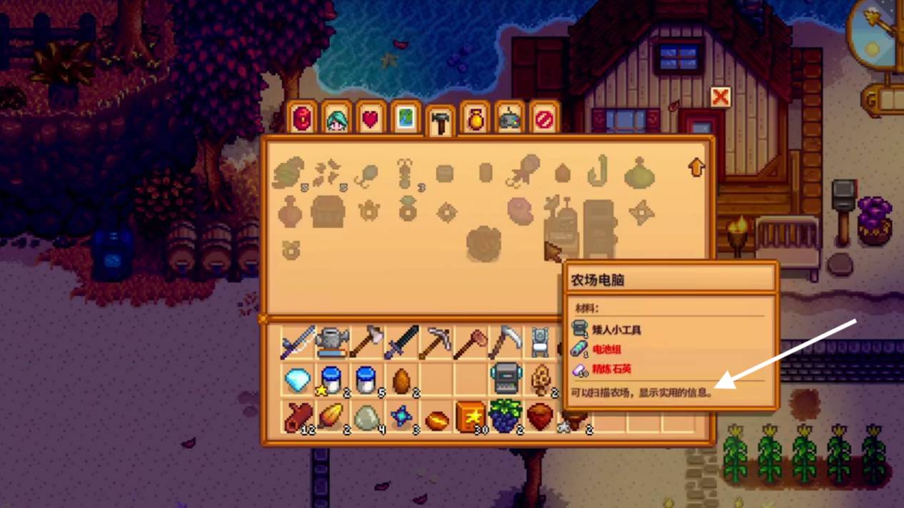 1、星露穀物語游戲中,農場電腦可以掃描農場,顯示實用的信息。