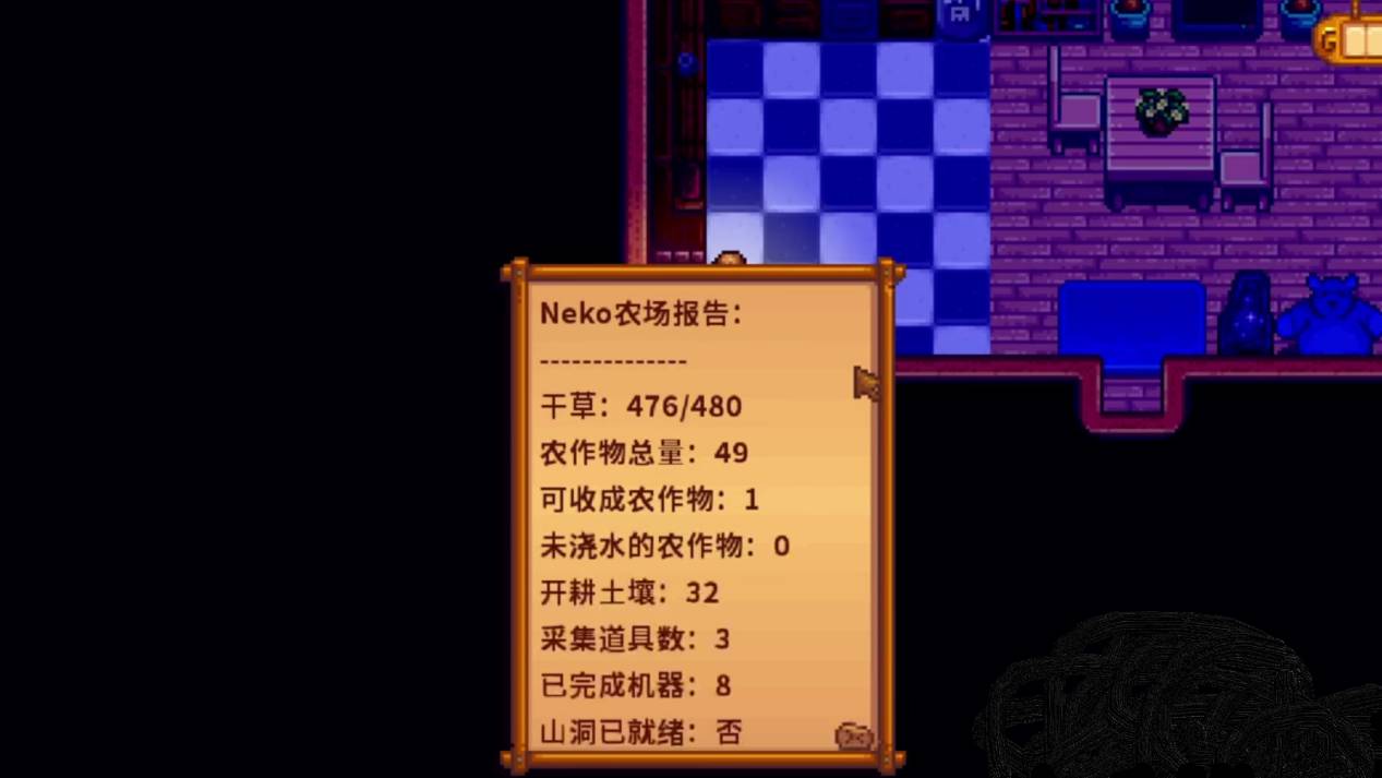 2、具體可以顯示的信息包括:乾草儲存量和農作物總量,可收成農作物數量,未澆水的農作物數量,溫室中可收成農作物,還有開耕土壤數,採集道具數,已完成機器數以及報告山洞是否已就緒。