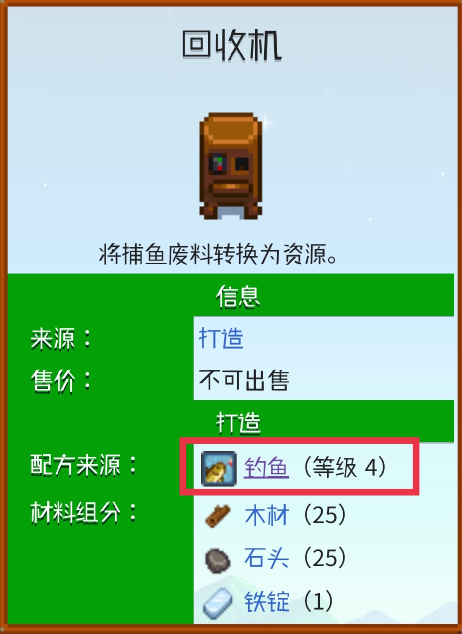 在星露穀物語這款游戲中,垃圾回收機的製作配方在釣魚4級時解鎖。回收機可以把大部分垃圾轉變成有用的材料,需要1個小時。