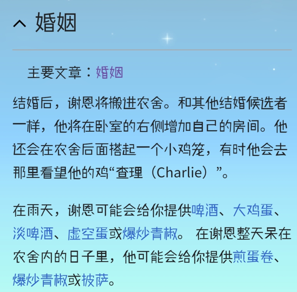 首頁 星露穀物語 問答 星露穀物語謝恩婚後劇情是怎樣的? 2023-01-06 在星露穀物語這款游戲中,謝恩結婚以後將搬進農舍。將在卧室的右側增加自己的房間。他還會在農舍後面搭起一個小雞籠,有時他會去那裡看望他的雞查理。其他劇情如下圖所示: