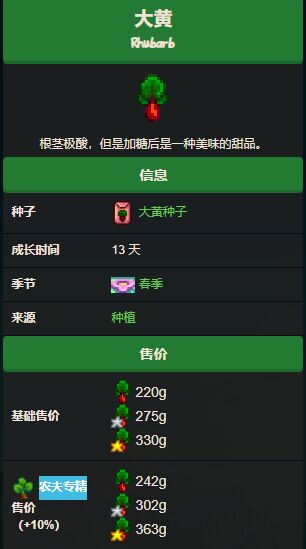 首頁 星露穀物語 問答 星露穀物語大黃怎麼賣劃算? 2023-01-06 1.星露穀物語大黃釀酒之後賣比較劃算。大黃種子長大之後生成的大黃,可以賣220g-363g,包含星級加成和農夫專精。總計天數為13天。2.釀酒之後,酒的價格是3倍的水果基礎價格,耗時7天。單位天內的收益較高。