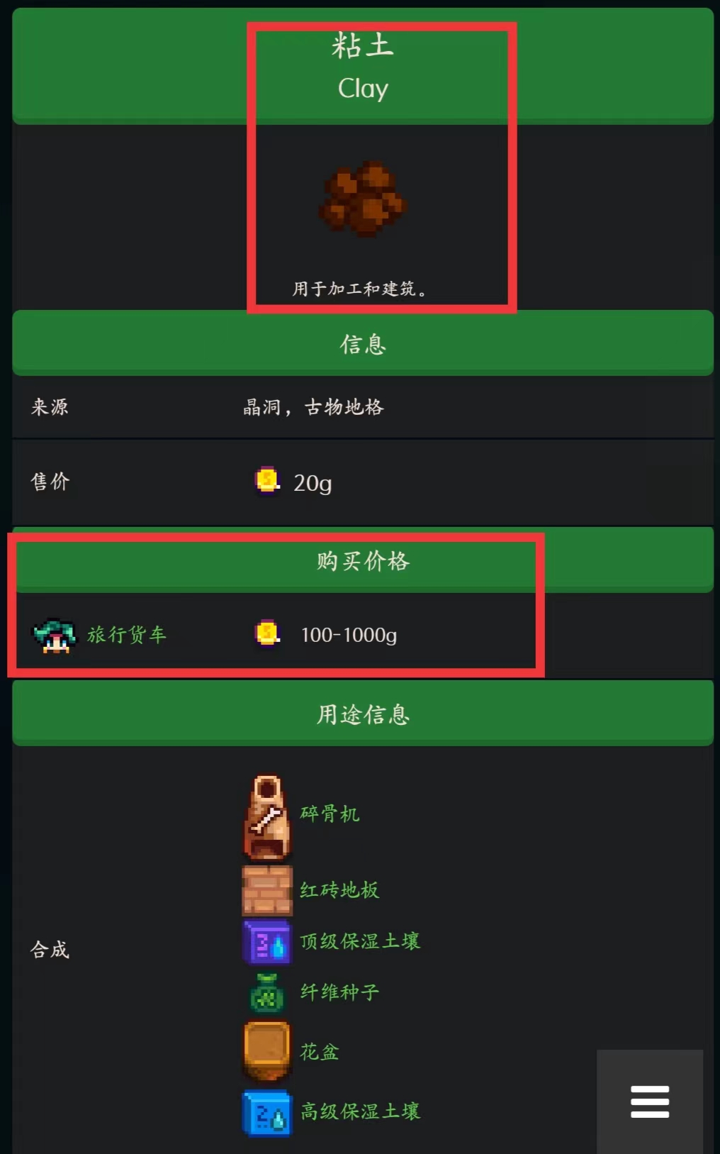 首頁 星露穀物語 問答 星露穀物語粘土哪裡買? 2023-01-07 粘土獲取方法介紹如下:在游戲《星露穀物語》中,玩家可以在旅行貨車花費100-1000g購買獲得,同時玩家可以從沙地、遠古斑點和鑿開晶球里獲得,此外在冬日星盛宴上也可能收到由賈斯或文森特贈送的黏土。