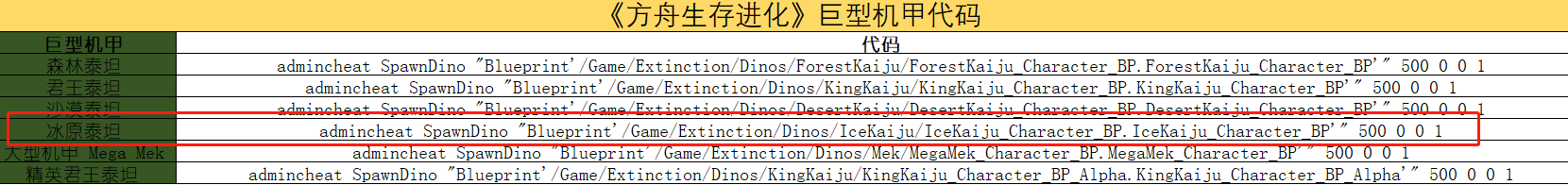 方舟冰原泰坦代碼是admincheat SpawnDino "Blueprint'/Game/Extinction/Dinos/IceKaiju/IceKaiju_Character_BP.IceKaiju_Character_BP'" 500 0 0 1,冰原泰坦是方舟目前的六個巨型機甲之一。