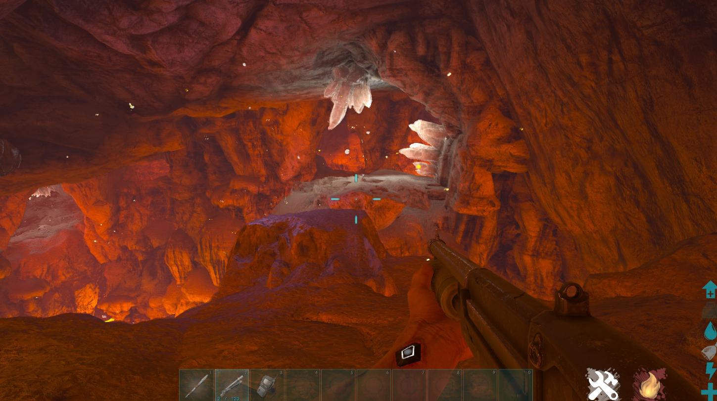 2、熔岩洞位置在(18.2,28.4),洞里怪物眾多,但擋不住高等級大地懶或恐熊,也可以噴驅蟲葯一路用抓鉤飛走,途中可以搜刮約十個各色寶箱,在通過熔岩密室後,可以挑戰熔岩石巨人,成功擊殺熔岩巨人可以一次性獲得相當於十個紅色寶箱的戰利品,這是除守護紫色空投外收獲最多的地方,獎品包含幾乎所有印痕技能的帶品質物品或藍圖。