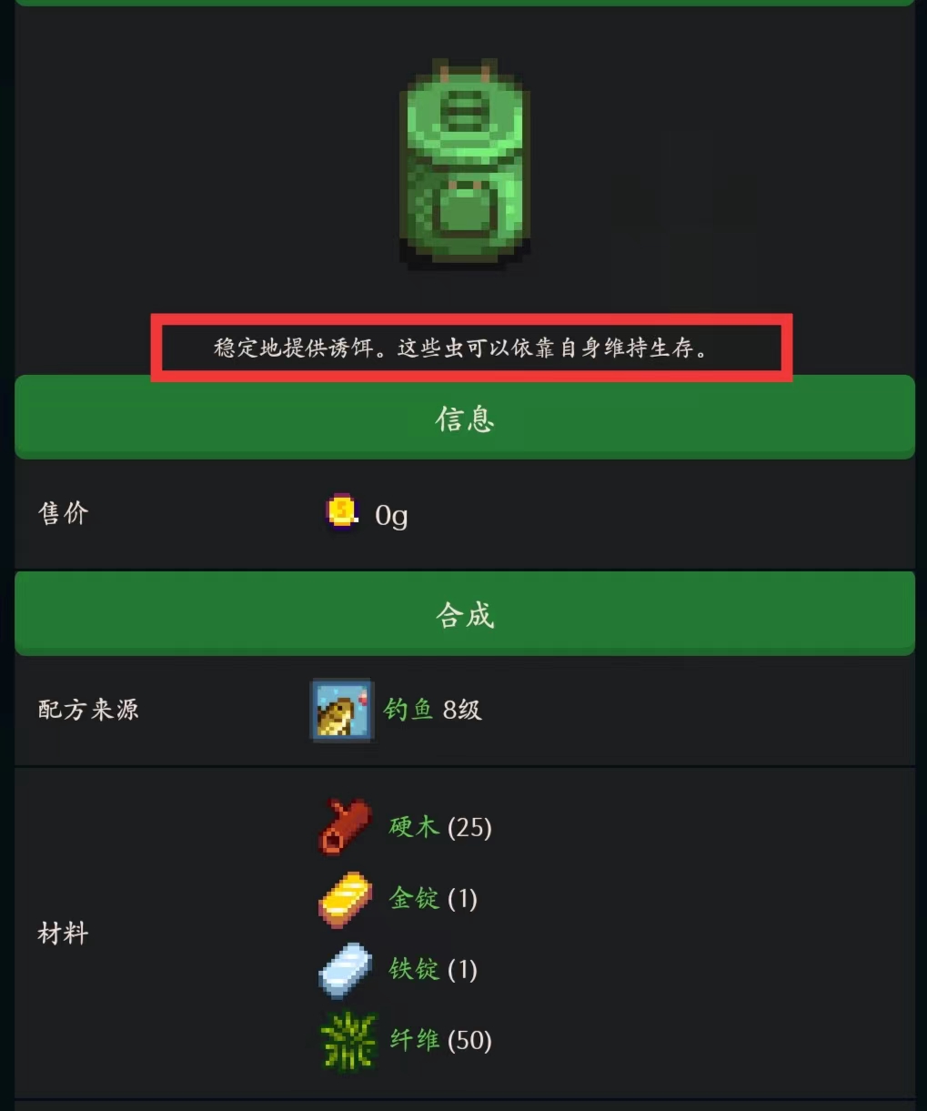 在游戲《星露穀物語》中,魚餌盒放置在戶外即可使用,一天可以製造2-5塊魚餌,製造配方會在釣魚技能達到8級之後解鎖。