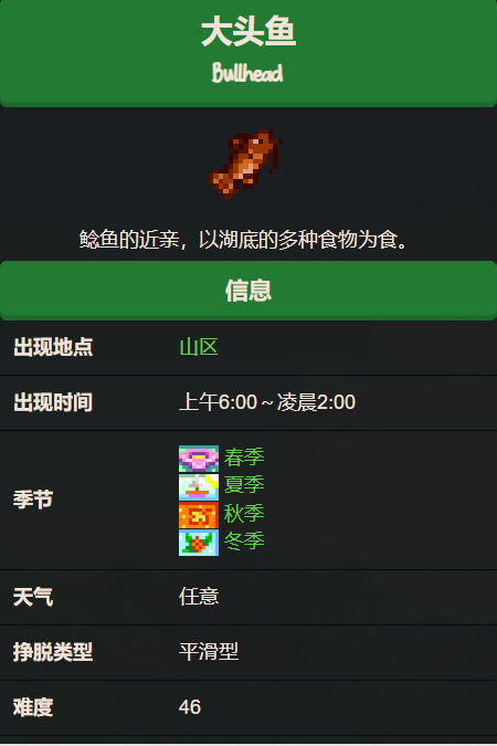 首頁 星露穀物語 問答 星露穀物語大頭魚怎麼釣? 2023-01-08 大頭魚可以在山間湖泊中捕獲,具體位置如下面地圖所顯示。然後大頭魚一般出現在山區,一般是6:00-凌晨2:00這時候最適合釣魚的時間。