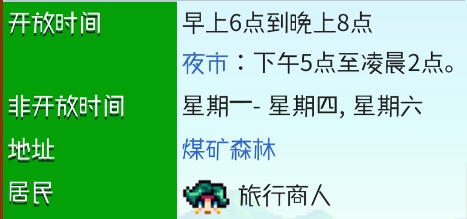 首頁 星露穀物語 問答 星露谷旅行貨車多久出現? 2023-01-08 旅行貨車是由貨車搭成的商店。它會在周五和周日出現在農場南部,煤礦森林北部偏西處。旅行貨車上的商人也會在夜市期間出現並售賣物品(冬季15日至17日)。具體開放時間如圖所示。
