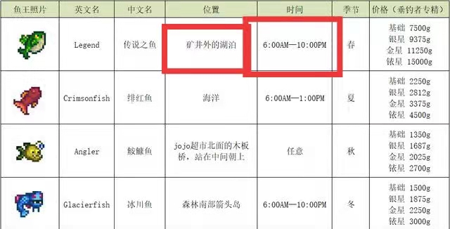 首頁 星露穀物語 問答 星露穀物語春季魚王出沒時間是什麼時候? 2023-01-08 春季魚王出沒時間介紹:在游戲《星露穀物語》中,春季魚王出沒時間天氣為春季雨天早上6:00到晚上10:00,分布在礦井外湖中,同時要求玩家釣魚等級為10級。