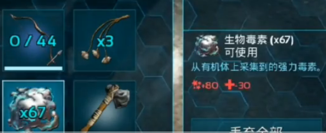 首頁 方舟:生存進化 問答 方舟生物毒素有什麼用? 2023-01-09 生物毒素可以用來增加生物的眩暈值。生物毒素可以替代麻醉葯直接使用,在馴服動物的時候放入生物背包點擊強制餵食,可以在16秒內增加80點的眩暈值,不過缺點是有保質期,一段時間後會自動過期,主要從水母身上獲得。