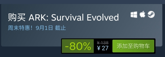 1.方舟生存進化於2020年8月28日在Steam平台進行史低促銷27元(-80%,原價138元),好評率69%。
