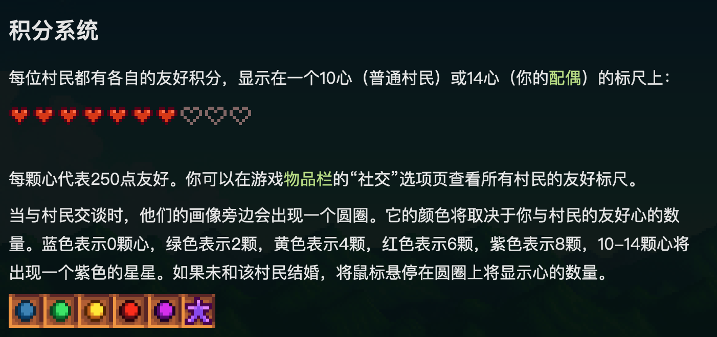 首頁 星露穀物語 問答 星露穀物語一顆心多少好感度? 2023-01-09 星露穀物語中的一顆心代表250點友好度。每位村民都有各自的友好積分,顯示在一個10心(普通村民)或14心(你的配偶)的標尺上,玩家可以在游戲物品欄的「社交」選項頁查看所有村民的友好標尺。