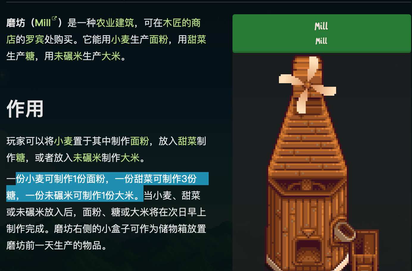 首頁 星露穀物語 問答 星露穀物語磨坊可以磨什麼? 2023-01-09 磨坊(Mill)是一種農業建築,可在木匠的商店的羅賓處購買。它能用小麥生產麵粉,用甜菜生產糖,用未碾米生產大米。一份小麥可製作1份麵粉,一份甜菜可製作3份糖,一份未碾米可製作1份大米。