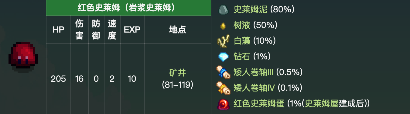 首頁 星露穀物語 問答 星露谷紅色史萊姆在哪裡刷? 2023-01-09 紅色史萊姆主要出現在礦井的第81-119層。我們進入礦井相應的層數就可以刷了,有大概率掉落史萊姆泥和樹液,有小概率掉落白藻、矮人卷軸、史萊姆蛋、鑽石等物品。