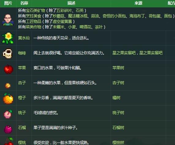所有寶石類礦物(除了五彩碎片、石英),所有烹飪美食(除了炒蘑菇、蒜油、奇怪的小麵包、荷包蛋、麵包),所有工匠物品(除了虛空蛋黃醬),所有菜類作物(除了小麥、啤酒花),蘋果、杏、橙子、桃子、櫻桃、石榴、咖啡、黃水仙。