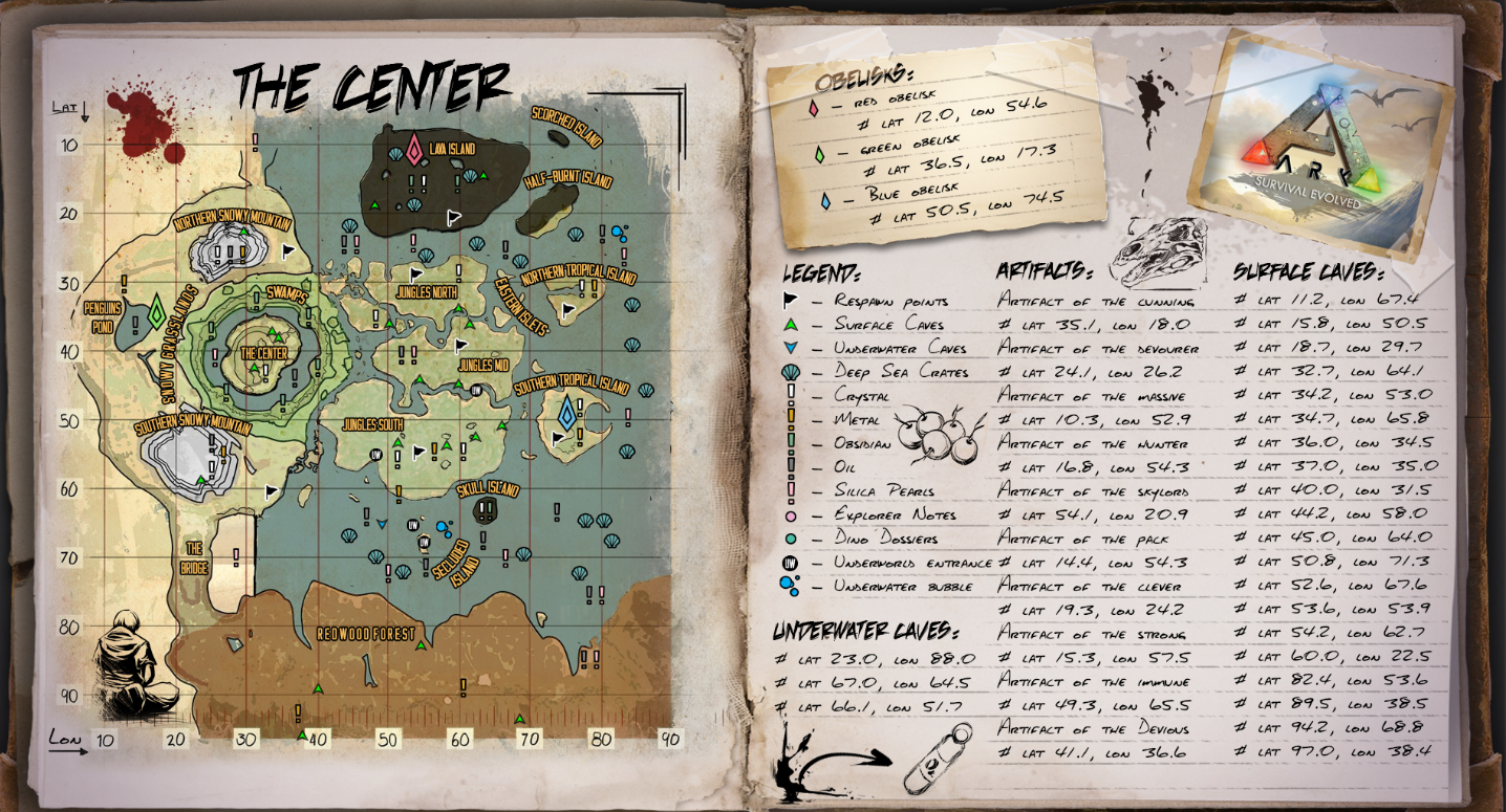 the center就是中心島地圖,是游戲中免費的dlc地圖。該地圖中央地帶基本沒有食肉龍,開局建家最好的地點,據說這裡的池塘里有河狸,但是還沒看到。北方熔岩島全是食肉龍,而且溫度高,新手去那基本死定了。然後空島那有風神,地圖西邊的山上有老鷹。然後礦物的話中央池塘區比較缺,雪山和山頂挺多的。