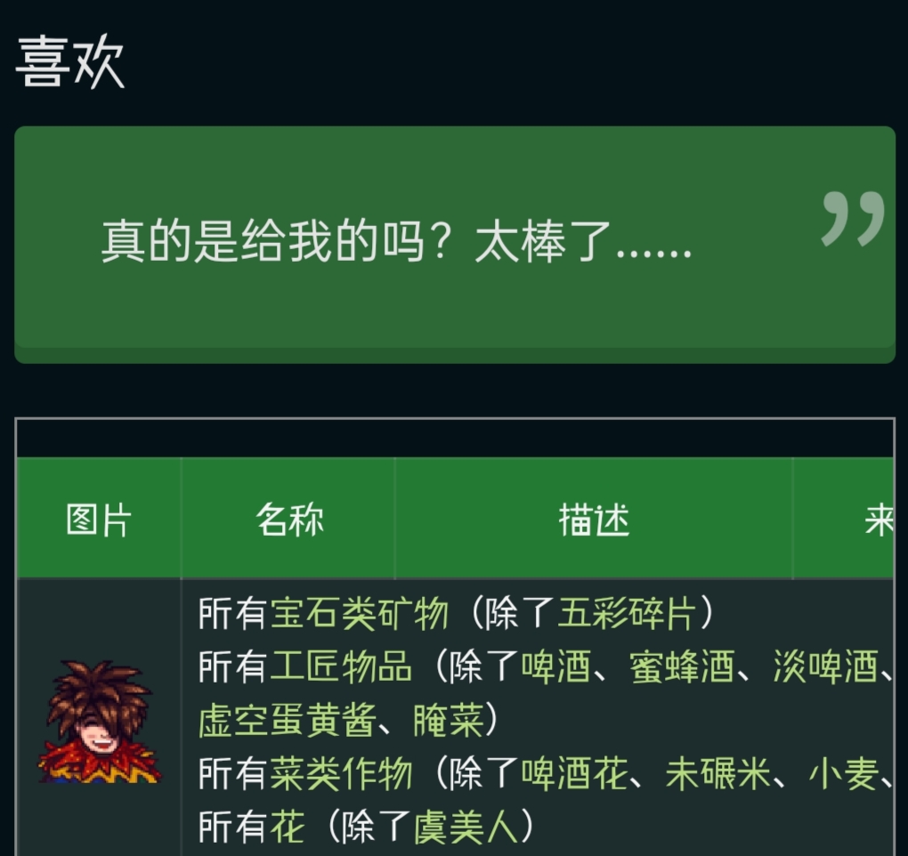 首頁 星露穀物語 問答 星露谷雷歐喜歡什麼禮物? 2023-01-10 在星露穀物語這款游戲中,雷歐喜歡所有寶石類礦物(除了五彩碎片),所有工匠物品(除了啤酒、蜜蜂酒、淡啤酒、果酒、虛空蛋黃醬、腌菜),所有菜類作物(除了啤酒花、未碾米、小麥、茶葉)和所有花(除了虞美人)。