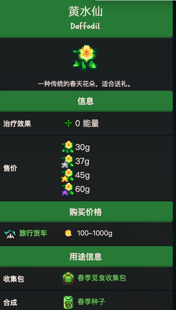 首頁 星露穀物語 問答 星露谷黃水仙哪裡找? 2023-01-10 黃水仙(Daffodil)是由春季種子生長而成的。春季時,可以在鵜鶘鎮里找到(撿到)。另外還可以在旅行貨車(豬車)中有機會刷新買到。但是旅行貨車中的價格不穩定,可能會以比較貴的價格才能買到,建議春季時多撿一些留著,不要過早售賣。