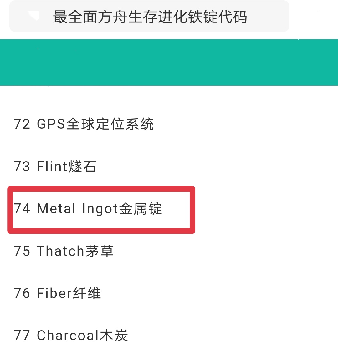在方舟里,金屬錠的代碼見 下圖紅框處;金屬錠是金屬煉製而成的材料,並且也是後期必備的材料,可用來製作工作台,機床以及各種槍支等。