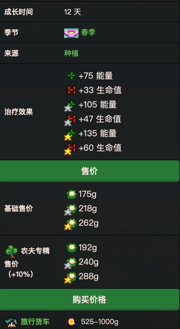 首頁 星露穀物語 問答 星露谷花椰菜哪裡有賣? 2023-01-10 花椰菜由花椰菜種子經過12天後長成,可以通過種植得到。玩家可以在皮埃爾的雜貨店中花費80g購買到花椰菜種子,在喬家超市中也可以購買到花椰菜種子,不過要100金幣的售價。如果想要直接買花椰菜的話,可以在旅行貨車中買到,價格隨機。