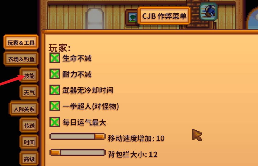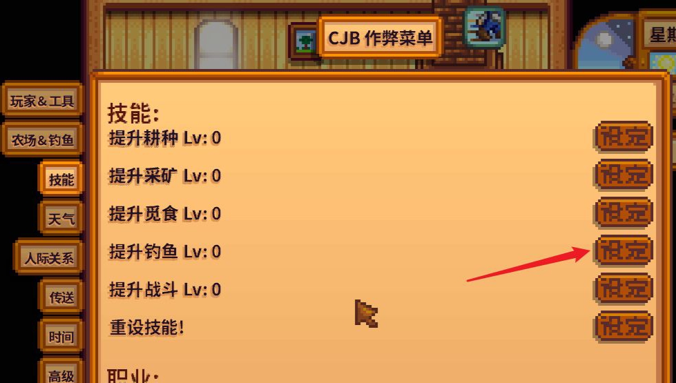 首頁 星露穀物語 問答 星露穀物語怎麼降低釣魚難度? 2023-01-11 1.使用SMAPI啟動游戲,在游戲中按P鍵,打開CBJ菜單,在CBJ菜單左側點擊技能按鈕。2.找到釣魚選項,點擊釣魚選項後面的設定按鈕。3.按一次設定,釣魚等級升一級,按十下加滿級。選擇需要的等級即可。