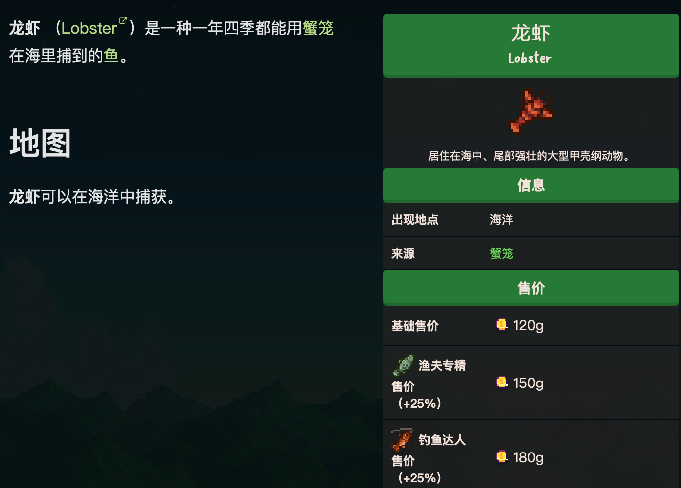 首頁 星露穀物語 問答 星露穀物語龍蝦是什麼季節的? 2023-01-11 龍蝦是一種一年四季都能用蟹籠在海里捕到的生物。所以想要捕捉龍蝦並沒有季節的限制。但是需要工具蟹籠才能進行捕撈。將蟹籠放在沙灘可以抓住龍蝦。可以由玩家製造,或者可以在漁具店以1500金幣買到。當到達一定釣魚等級時,也能獲得一個。