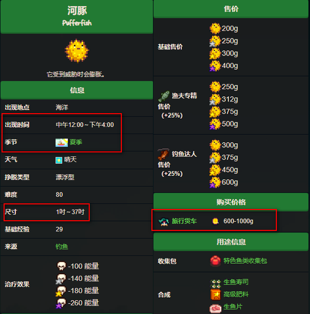 首頁 星露穀物語 問答 星露谷河豚代碼是多少? 2023-01-11 河豚代碼是128。河豚是一種能在海里捕到的魚,只會在夏季的中午12:00~下午4:00出現,天氣:晴天,尺寸:1吋~37吋,旅行貨車購買價格:600-1000g。