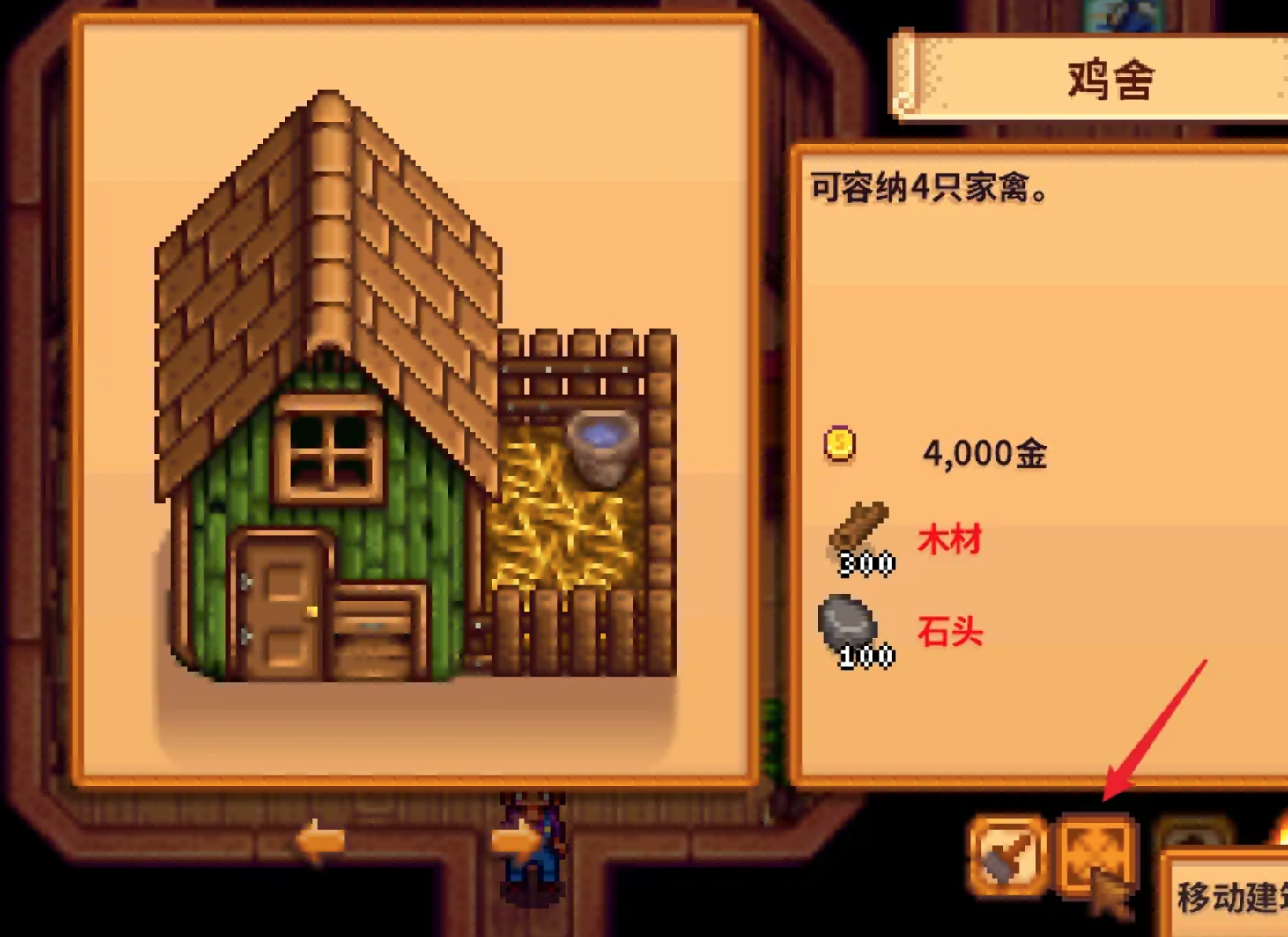 首頁 星露穀物語 問答 星露谷建築怎麼改位置? 2023-01-11 1、我們來到鵜鶘鎮的北邊,右擊大門進入木匠店鋪。和木匠對話,在列表中點擊【建造農場建築】。2、在建築詳情界面就可以看到移動按鈕,點擊【移動建築】按鈕。3、然後我們選中自家農場內的任意建築,將建築移動到合適地方即可。