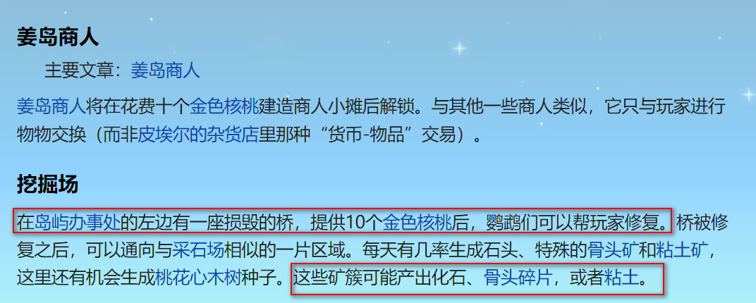 首頁 星露穀物語 問答 星露穀物語姜島化石收集地點都在那哪裡? 2023-01-11 在島嶼辦事處的左邊有一座損毀的橋,提供10個金色核桃後,鸚鵡們可以幫玩家修復。橋被修復之後,可以通向與採石場相似的一片區域。這些礦簇可能產出化石。