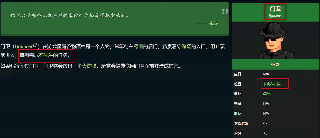 首頁 星露穀物語 問答 星露谷沙漠門衛怎麼解鎖? 2023-01-11 沙漠門衛直到完成齊先生的任務才能解鎖,他常年待在綠洲的後門,負責看守賭場的入口,阻止玩家進入,如果強行闖過門衛,門衛將會放出一個大炸彈,玩家會被傳送回門衛面前並造成傷害。