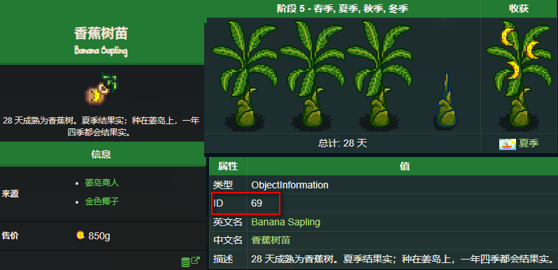 首頁 星露穀物語 問答 星露穀物語香蕉樹苗代碼是多少? 2023-01-12 香蕉樹苗代碼:69。需要28天長成香蕉樹,長成後在夏季每天會結出一個香蕉。種植在姜島或者溫室的香蕉樹所有季節都會結出果實。玩家可以在姜島商人處花費5個龍牙換取香蕉樹苗。砸開金色椰子也有概率獲得香蕉樹苗。