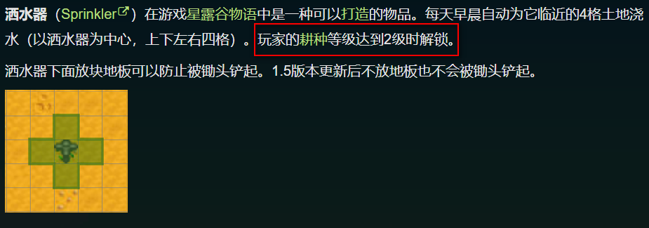 首頁 星露穀物語 問答 星露穀物語灑水器在這塊地上無法使用怎麼辦? 2023-01-12 灑水器在這塊地上無法使用是由於玩家的耕種等級沒有達到2級。解鎖後的灑水器每天早晨自動為它臨近的4格土地澆水(以灑水器為中心,上下左右四格)。