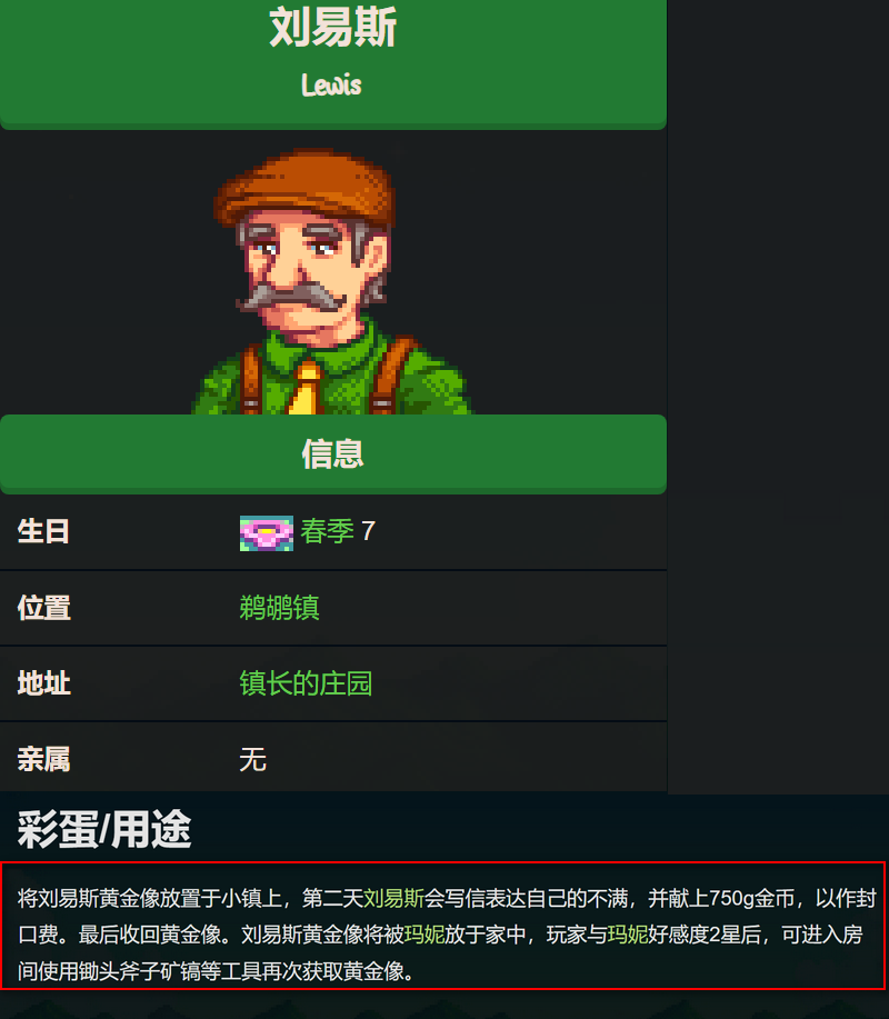 首頁 星露穀物語 問答 星露穀物語劉易斯黃金像能幹嗎? 2023-01-12 將劉易斯黃金像放置於小鎮上,第二天劉易斯會寫信表達自己的不滿,並獻上750g金幣,以作封口費,最後收回黃金像。劉易斯黃金像將被瑪妮放於家中,玩家與瑪妮好感度2星後,可進入房間使用鋤頭斧子礦鎬等工具再次獲取黃金像。