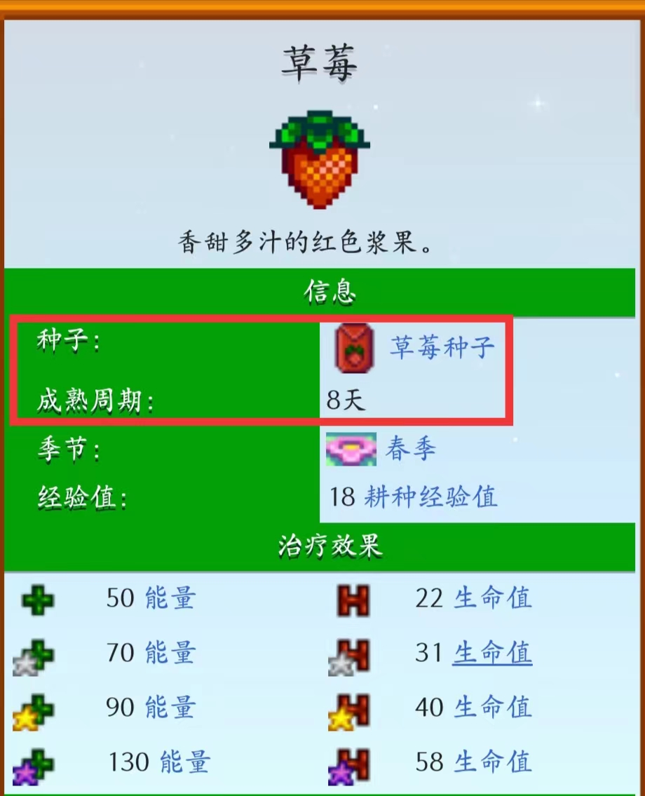 首頁 星露穀物語 問答 星露穀物語草莓可以收穫幾次? 2023-01-12 在游戲《星露穀物語》中,草莓是一種農作物,由草莓種子經過8天後長成,之後每4天可以收穫一波,由於是春季作物,到了夏天就會枯萎,那麼春天草莓能收穫6次,但由於第一年的種子要到春季第13天的節日上購買,所以第一年是無法收6次的。