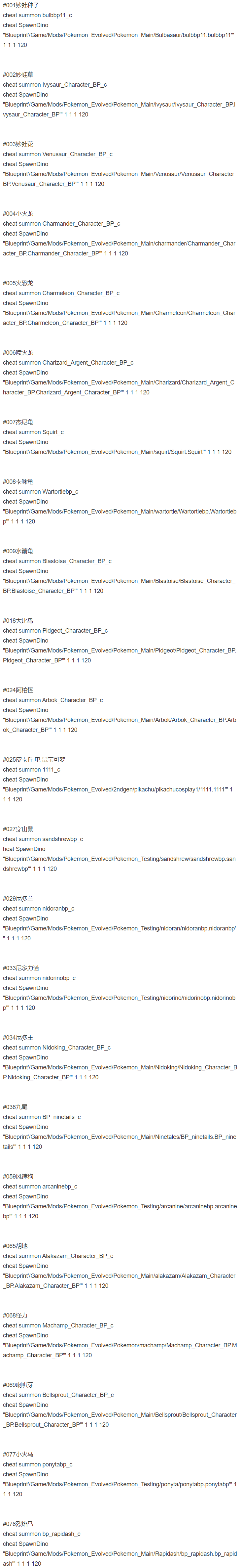 1、方舟中妙蛙種子、妙蛙草、小火龍、傑尼龜、皮卡丘等神奇寶貝代碼