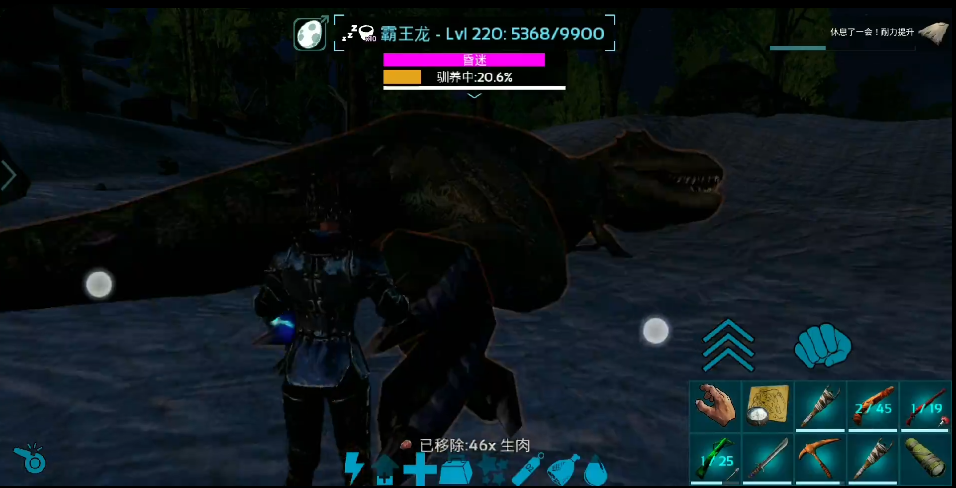 2、然後我們餵食靜心膏獲得十倍馴服速度,在餵食霸王龍優質生肉,這個時候一塊肉就能加百分之20的進度,速度還是相當快了。