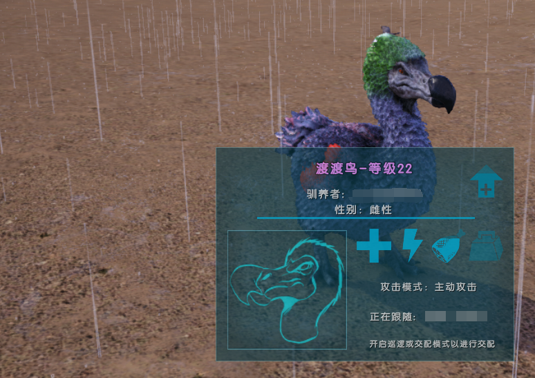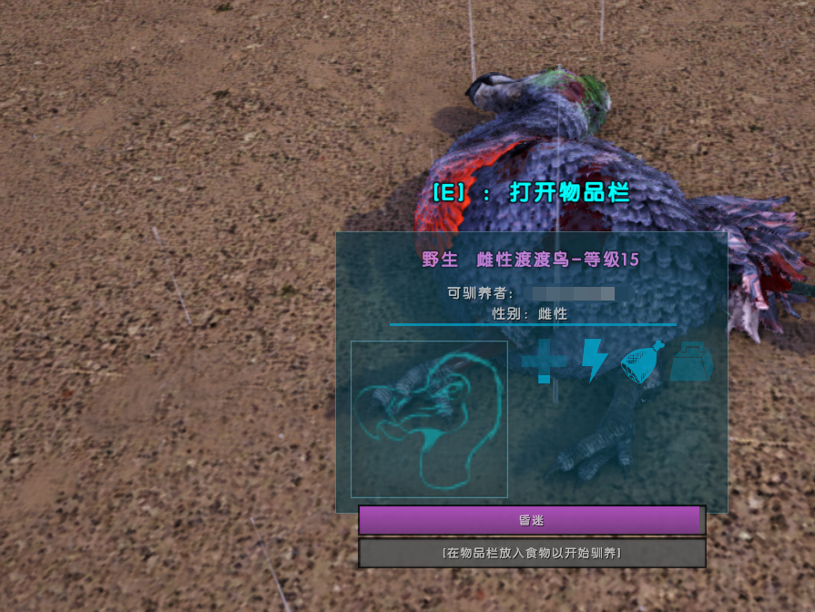 首頁 方舟:生存進化 問答 方舟馴服生物的流程是什麼? 2023-01-14 方舟馴服生物的流程如下:1、玩家打開游戲後,找到一隻動物,比如:渡渡鳥,再用麻醉類武器攻擊。2、然後將動物打暈,打暈後,放入食物。3、放入後,等待馴服進度完成即可馴服生物,如下圖: