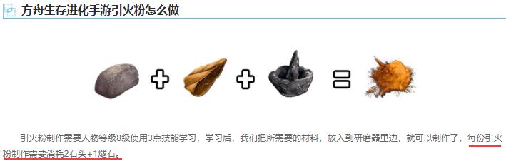 首頁 方舟:生存進化 問答 方舟引火粉怎麼獲得? 2023-01-15 方舟:生存進化游戲中的引火粉是需要玩家集齊材料自己製作的,所需原料是2石頭和1燧石,湊齊材料後放入研磨器中即可製作引火粉了,製作完成可獲得1引火粉。