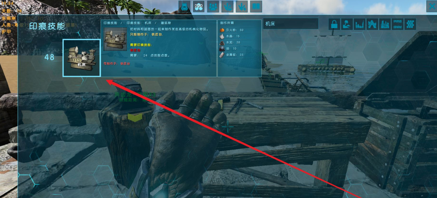 首頁 方舟:生存進化 問答 方舟機床多少級解鎖? 2023-01-17 方舟生存進化游戲中,機床技能需要玩家到達48級後才能解鎖,如下圖所示,玩家在印痕里找到機床的技能進行學習,然後玩家就可以去鐵匠台中製作機床了。