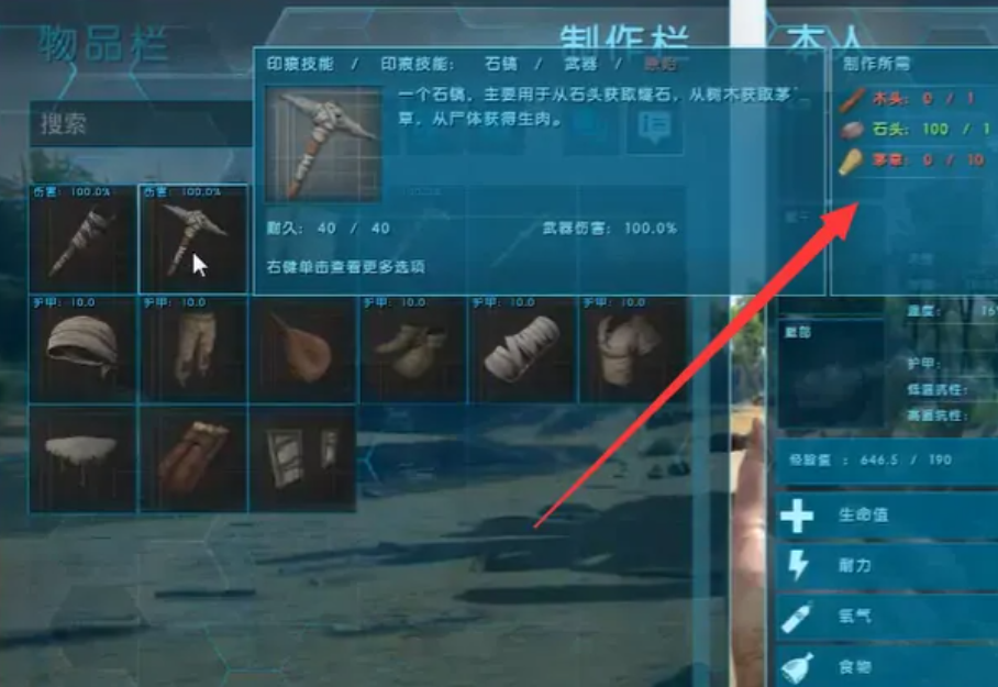 首頁 方舟:生存進化 問答 方舟:生存進化怎麼做石鎬? 2023-01-18 1、按V鍵打開製作欄,查看石鎬需要的材料,木頭,石頭,茅草,如圖。2、石頭地上都是,直接撿就可以獲得。3、木頭和茅草需要自己用手打樹木就可以獲得。4、最後回到製作欄,右鍵單擊石鎬選擇製作一個即可。