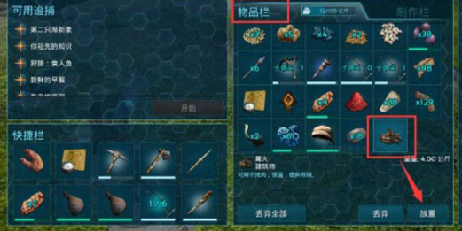 首頁 方舟:生存進化 問答 方舟如何放置篝火? 2023-01-18 一、在【方舟:生存進化】物品欄中找到篝火,點擊右下角的放置按鈕,如下圖所示;二、出現放置篝火的虛影,找個平坦的地方,虛影變成綠色時點一下屏幕篝火就放置成功了,如下圖所示。