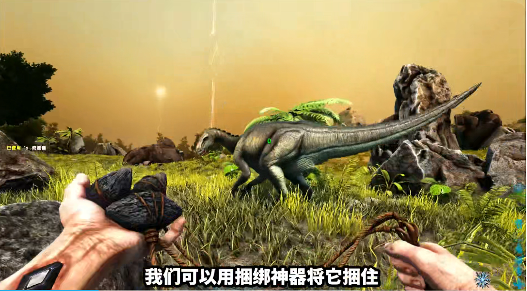 1、方舟禽龍的馴服方式還比較簡單的,首先我們用捆綁神器「流星錘」,將其捆住