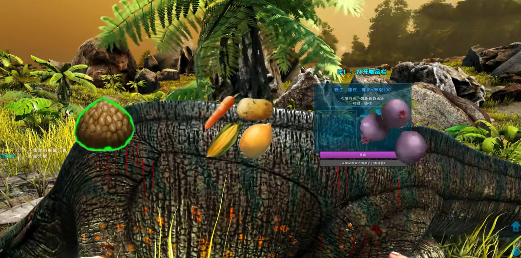 3、倒下後餵食,優先簡易飼料,然後是蔬菜,條件不行就為紫色漿果,然後即可成功馴服禽龍