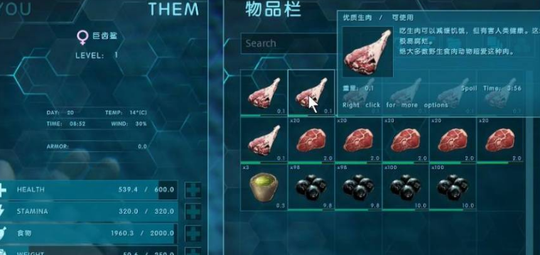 然後玩家點開背包,打開其物品欄。往其物品欄中放入馴服材料, 優質生肉,麻醉劑、黑果子等。