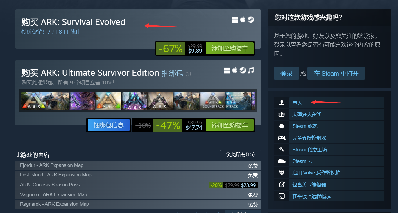 首頁 方舟:生存進化 問答 方舟生存進化有單人模式嗎? 2023-01-18 「方舟:生存進化」是有單人模式的。1,首先我們進入Steam搜索這款游戲,點擊進入游戲界面。2,然後往下滑動找到游戲標簽,就會發現該游戲有單人模式的。